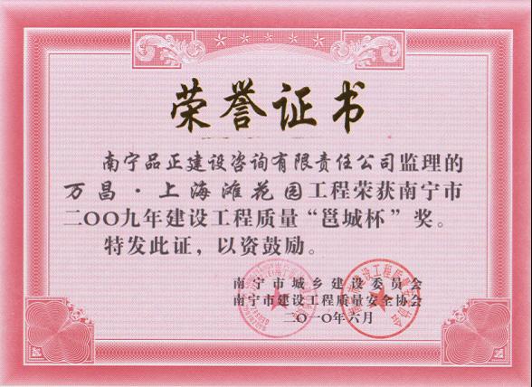 2010年6月,南寧品正負責監(jiān)理的南寧市南站南側(cè)路工程C標、E標、南寧市江南堤路園項目市政工程道路施工1#標、南寧市精品線路綜合整治工程(一期)B標、南寧市五象廣場周邊區(qū)域市政設施綜合整治工程I標工程、南寧市五象廣場周邊區(qū)域市政設施綜合整治工程I標、南梧大道工程(高速環(huán)二塘收費站到三塘下丹橋)NO.7標段、萬昌·上海灘花園工程、廣西明陽工業(yè)園啟動區(qū)道路工程III標等多個工程分別榮獲南寧市城鄉(xiāng)建設委員會、南寧市建設工程質(zhì)量安全協(xié)會頒發(fā)的南寧市2009年建設工程質(zhì)量“邕城杯”獎。